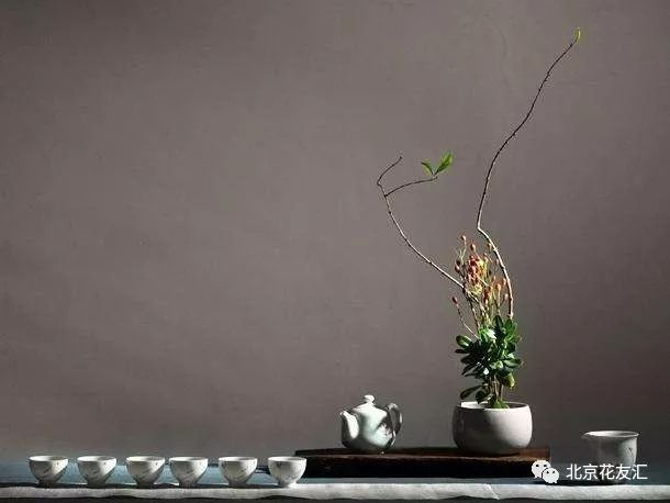茶艺插花立意重在“真、新、高、洁”,反应时令、以花传情、彰显主题等;作品常常简约、素雅,呈现出线条美及韵律感,同时多选取自然花材及东方式插花花材。